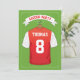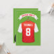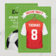 Cartes d'invitation pour fête d'anniversaire sur le thème de football avec un fond vert de terrain de football, un maillot de sport rouge et blanc avec votre nom et numéro, un ballon de football et un modèle de fête moderne.