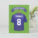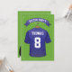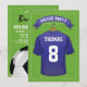 Cartes d'invitation pour une fête d'anniversaire sur le thème du football avec un fond vert de terrain de football, un maillot bleu avec votre nom et numéro, un ballon de football et un modèle de fête moderne.