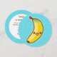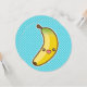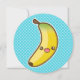 Personnage de fruit de banane de dessin animé jaune mignon avec une expression de visage heureux. La couleur de fond est bleue avec un motif à pois légers.