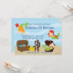 Cette mignonne invitation personnalisée à la fête d'anniversaire de la sirène présente une scène sous la mer avec trois sirènes et un coffre au trésor rempli de cadeaux.