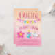 Une invitation à l'anniversaire à thème unicorne pour votre enfant de trois ans, ce design présente un arrière - plan d'aquarelle rose avec "Un anniversaire magique" écrit dans de belles graphiques et polices de caractères. En dessous, un exemple de texte "Tiffany tourne" avec une bougie d'anniversaire éclairée "3" en bleu. Achetez dès aujourd'hui votre invitation à l'anniversaire de la licorne !