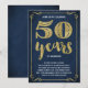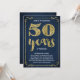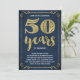 Cette invitation de fête d'anniversaire de mariage de 50 ans chic et élégante présente une typographie vintage, des fioritures élégantes, une calligraphie au pinceau, un faux papier doré et un fond bleu marine chic.
