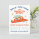 Fête d'anniversaire pour les Fêtes de Noël en voiture. Comprend une voiture orange rétro avec des rennes et des manchots passagers. La voiture contient un arbre de Noël et des cadeaux dans le camion, entourés d'étoiles. Tout le texte peut être modifié. Idéal pour un garçon ou une fille !