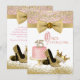 Cartes d'invitation Quinceanera rose et or avec un beau gâteau rose et or avec des chiffres en diamants, chaussures à talons hauts scintillantes or et une élégante tiare en diamants et or sur un fond rose et or. Vous pouvez facilement personnaliser ces magnifiques invitations Quinceanera princesse rose et or pour votre événement en ajoutant simplement vos informations dans le style de police et la formulation de votre choix. Il s'agit d'un design imprimé sans véritable paillettes, diamants, rubans, etc.