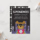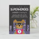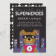 Joli modèle d'invitation à la fête d'anniversaire pour la soirée à thème superhéros d'un garçon. Illustration d'un chien en tenue de super-héros devant un horizon urbain. Le texte en haut dit "Appeler tous les super-héros". Les informations du parti sont les suivantes. Customisez ce produit en ajoutant l'âge du garçon d'anniversaire sur la chemise de super-héros du chien. Les textes sont facilement modifiables en ligne.