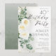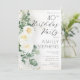 Célébrez un événement spécial avec cette élégante invitation pour un 40e anniversaire, mettant en vedette des roses blanches romantiques et une verdure de eucalyptus doux. Ce design floral sophistiqué allie un style botanique intemporel à une typographie moderne, créant une belle invitation pour une célébration d'anniversaire élégante.