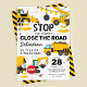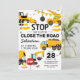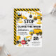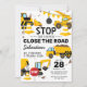 Cartes d'invitation à une fête d'anniversaire sur le thème de la construction avec un fond blanc simple, avec de mignonnes illustrations de cartoon de fanions, de panneaux de signalisation, d'un camion à benne, d'une pelleteuse, d'un camion à ciment, d'une grue à boule de démolition, de taches de terre et d'un modèle de célébration d'anniversaire pour enfants moderne facile à personnaliser.