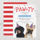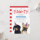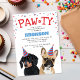 Cartes d'invitation de fête d'anniversaire de chien mignon avec un bouledogue français et un teckel, tous deux portant des chapeaux de fête, des confettis rouges et bleus, le mot "PAW-TY", et un modèle simple de fête pour animaux de compagnie.