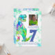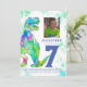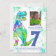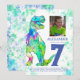 Invitation colorée pour une fête d'anniversaire sur le thème des dinosaures avec modèle de photo pour le garçon qui fête ses sept ans et qui aime les dinosaures. Ce T-Rex rugissant invite les fans de dinosaures à une fête d'anniversaire amusante pour ses sept ans. Personnalisez cette invitation d'anniversaire colorée à l'aquarelle avec des éclaboussures bleues et vertes pour les 7 ans avec une photo du garçon ou de la fille qui fête son anniversaire, le nombre d'années et les détails de la fête et vous êtes prêt pour une fête d'anniversaire sur le thème des dinosaures pleine d'amusement. Toutes les espèces de dinosaures sont les bienvenues. Une œuvre d'art originale unique et magnifique réalisée par l'artiste Catherine Sweetman.
