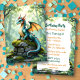 Un joli dragon bleu et vert à thème invitation de fête d'anniversaire pour les garçons. Un dragon mignon sur un vieux thème mossy pierre sci fi anniversaire thème.