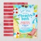 Vous cherchez une invitation à la fête d'anniversaire pour filles sur le thème de la plage ? Ce design coloré présente divers éléments estivaux tels que des lunettes de soleil, une chaise de plage, des palmes, un ballon de plage et plus encore. Idéal pour une fête sur la plage et peut être utilisé pour différents âges.