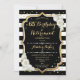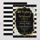 Invitation à une fête d'anniversaire et de retraite. Design élégant en noir, blanc et or. Caractéristiques : rayures noires et blanches, roses, police de caractères script stylisée, or pailleté faux et confettis. Parfait pour une célébration conjointe glamour d'anniversaire et de retraite. Personnalisez avec vos propres détails.