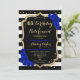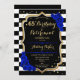 Invitation à une fête d'anniversaire et de retraite. Design élégant en noir, or et bleu royal. Caractéristiques rayures noires et blanches, police de caractères script stylée, or à paillettes faux et confettis. Parfait pour une célébration conjointe d'anniversaire et de retraite glamour. Personnalisez avec vos propres détails.