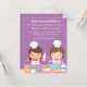 Prévoyez une fête d'anniversaire de cuisson et obtenez vos enfants les invités impliqués dans le procédé de boulangerie d'amusement et faites les petits gâteaux et les biscuits qu'ils peuvent apprécier à la partie ou à emporter ! Cette invitation comporte deux chefs mignons de petite fille. La fille avec l'agrafe de cheveux rouge se tient sur un sac pipping et décore les petits gâteaux avec le givrage rose. La fille avec la bande rose de cheveux tient un battage et prépare le mélange de cuisson. L'abondance des ingrédients de cuisson sont sur la table qui inclut le récipient, la tasse, le bol, le plateau des petits gâteaux, le carton d'oeufs, le bol mélangeur, le beurre et le lait de sucre. Que fait cuire à la partie ? La palette de couleur du rose et du pourpre est girly et bonbon pour une fille d'anniversaire ! Page inverse de motif de pois pourpre. Personnalisez facilement avec vos détails de partie !