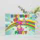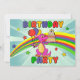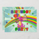 Invitations mignonnes de partie de cadeau d'anniversaire de dinosaure d'enfants montrant un dinosaure rose et pourpre mignon tenant des ballons jaunes et bleus rouges et un gâteau d'anniversaire avec un arc-en-ciel et des étoiles colorées multic à l'arrière-plan. Entièrement personnalisable avec vos propres détails de partie pour créer un grand cadeau d'anniversaire de dinosaure d'invitation mignonne unique de partie pour l'enfant qui aime des dinosaures. Graphique original de dinosaure sous le permis de l'usine de graphiques. sgb01