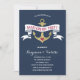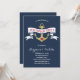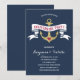 Cette invitation de fête d'anniversaire de mariage nautique présente une ancre à paillettes dorées fausses, une bannière vintage bleue et blanche, un cœur rouge mignon et un fond bleu marine.