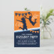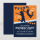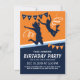 Cartes d'invitation pour anniversaire au parc de trampoline avec un fond bleu et orange, des enfants sautant et volant dans les airs et un modèle de texte simple.