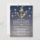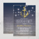 Cartes d'invitation d'anniversaire pour homme adulte avec un fond dégradé bleu en bois rustique, une ancre en feuille d'or chic, des guirlandes de lumières scintillantes et une écriture moderne blanche.