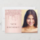 Une invitation glamour pour une fête d'anniversaire du 16ème (ou de tout âge). Un arrière - plan à dégradé d'or rose décoré d'or rose et de faux parties scintillant rose gouttes, la peinture goutte à goutte. Personnalisez et ajoutez votre propre photo verticale de la fille d'anniversaire. Ajoutez les détails de votre fête à l'arrière.