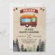 Émerveillez vos invités avec cette invitation de fête d'anniversaire sur le thème de camping rustique avec des éléments mignons et une typographie accrocheuse. Ajoutez simplement vos détails d'événement sur ce modèle facile à utiliser pour en faire une invitation unique. Retournez la carte pour révéler un motif à carreaux rouge buffalo au dos de la carte.