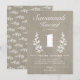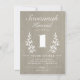 Une invitation à la fête d'anniversaire des enfants rustique premier comportant le nom et l'âge de l'enfant en grand, entouré de branches de laurier dessinées à la main sur un fond de grain de bois de chêne blanc. Au verso de l'invitation se trouve un motif de branche de laurier coordonné.