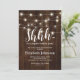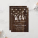 Cartes d'invitation de fête d'anniversaire surprise élégantes avec un fond en bois rustique, des guirlandes lumineuses et un modèle de texte de célébration d'anniversaire moderne.