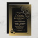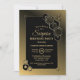 Une invitation moderne à une fête d'anniversaire surprise encadrée de noir et d'or géométrique.