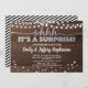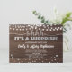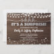 Élégante invitation de fête surprise argentée avec conception de guirlande lumineuse sur fond de bois rustique. Conception élégante.