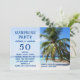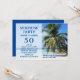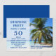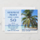 Cartes d'invitation pour une fête d'anniversaire sur le thème tropical pour adultes. Le fond représente une scène tropicale avec un grand palmier penché sur une mer calme. Tout le texte est de couleur bleu clair et se trouve sur le côté gauche des cartes horizontales. Seul le texte de RSVP est sous le palmier. Le texte exemple est pour une fête d'anniversaire surprise pour un homme, mais convient également pour une femme. Remplacez "surprise" par "anniversaire" si votre fête n'est pas une surprise.