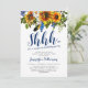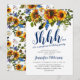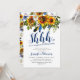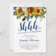 Cartes d'invitation de fête d'anniversaire surprise boho bleu marine et jaune avec un fond blanc classique qui peut être changé en n'importe quelle couleur, un arrangement floral de tournesol à l'aquarelle, des plumes et un modèle d'invitation à une fête d'anniversaire élégant.