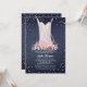 Un modèle d'invitation de fête d'anniversaire Sweet 16 simple, moderne, élégant et chic avec un fond en denim, des colliers de perles sur une robe de ballerine en tutu rose avec des volants roses et des éclats de diamants (simulés, pas de vrais diamants) et une typographie moderne en blanc. Un design chic « denim et diamants et perles ».