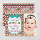 Invitation de fête d'anniversaire tribal pour filles avec des flèches tribales et un nœud bleu sarcelle foncé sur un joli fond de design amérindien sud-ouest aztèque. Vous pouvez facilement personnaliser cette adorable invitation d'anniversaire tribal en ajoutant simplement votre photo et les détails de l'événement. Il s'agit d'une conception imprimée sans vrais nœuds, paillettes, etc.