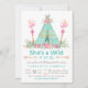 Les filles sauvages une invitation de fête de premier anniversaire avec des tipis tribaux rustiques et des ballons sur un joli arrière - plan floral et de flèche tribale. Ces invitations de fête d'un premier anniversaire sauvage tribales sont facilement customisées pour votre événement en ajoutant simplement vos détails.
