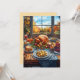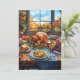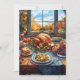 L'image représente une table de Thanksgiving joliment dressée dans un cadre chaleureux et cosy. Une grande dinde rôtie est au centre, entourée de plats comme des pommes de terre rôties, de la tarte en couches, du raisin et de petits citrouilles pour la décoration. La table est recouverte d'un chiffon bleu, et l'arrière - plan donne une vue pittoresque sur le feuillage d'automne à travers une grande fenêtre, avec des orangers, jaunes et rouges éclatants sous un ciel partiellement nuageux. L'ambiance générale est festive et accueillante, parfaite pour un rassemblement en famille.