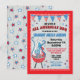 Cartes d'invitation pour une fête de BBQ américain patriotique. Comprend des banderoles de drapeau, des couleurs rouge, blanc et bleu, un grill à BBQ et des étoiles. Le tout sur un fond en bois blanchi. Idéal pour célébrer le 4 juillet, la fête de l'Indépendance, la fête du Travail ou pour honorer votre héros militaire qui est rentré chez lui !