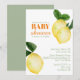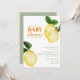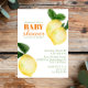 Cette invitation personnalisée pour une fête de bébé a un thème de fruits citriques. Deux citrons aquarelle sont placés en haut à droite, avec un autre citron en bas à gauche. Le titre "Fête de Bébé" est imprimé dans une couleur orange vif, avec le reste du texte en vert citron.