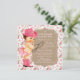Adorable petite cowgirl rose avec chapeau de cowboy rose et bottes de cowboy roses avec toile de jute sur un fond calicot floral rose doux. Cette invitation de fête de bébé cowgirl en toile de jute rose est facilement personnalisable pour votre événement en ajoutant simplement vos détails dans le style de police et la couleur, la formulation et la mise en page de votre choix.