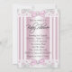 Invitation adorable de fête de bébé fille rose et argentée en tutu de danseuse avec un collier de perles et une jolie couronne sur fond de dentelle rose. Cette invitation de fête de bébé danseuse rose est facilement personnalisable pour votre événement en ajoutant vos détails d'événement, style de police, taille et couleur de police, et texte.