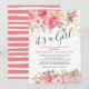 Cartes d'invitation fête de bébé fille automne avec un fond chic blanc pouvant être changé en n'importe quelle couleur, de jolies fleurs aquarelles roses, une citrouille rose pastel et un modèle de fête bébé moderne facile à personnaliser.