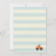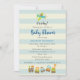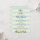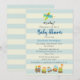 Une invitation à une fête de bébé garçon. Conçue avec une illustration d'art de nursery sur le thème des enfants avec un petit chien voyageant dans un avion et un train jouet rempli d'animaux fantaisistes. Sur un fond rayé crème et bleu.