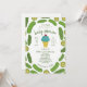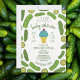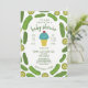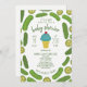 Une invitation à une fête de bébé avec une illustration de bordure de pickles et de tranches de pickles ondulées. Illustration d'un cône de glace bleue surmonté de cerise et de paillettes au centre. Personnalisez le texte.