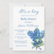 C'est un garçon ! Peinture aquarelle de fleurs de bleuets par Monika Howarth. Bleuets du Texas. Illustration florale bleue de la nature, invitation à la fête de bébé. Personnalisez-la avec vos détails.