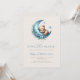 Cette invitation de fête de bébé bohème adorable présente un ours aquarelle endormi sur un croissant de lune bleu décoré de fleurs bleues, au-dessus des mots "outre la lune" en écriture manuscrite bleue. Personnalisez le texte avec le nom de la future maman en écriture et les détails en police sans serif sur un fond beige. Idéal pour une fête de bébé garçon.