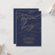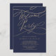 Cette invitation romantique marine et mariage d'or à la fête d'accueil est parfaite pour un mariage moderne. Le design classique moderne comprend des tourbillons fantaisistes et des fleurs fantaisistes avec une superbe élégante typographie de l'or en faux champagne. Remarque : Ce design ne comporte pas de véritable feuille d'or. C'est un graphisme de haute qualité fait pour ressembler à du papier doré.