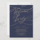 Cette invitation de fête de bienvenue de mariage romantique bleu marine et or est parfaite pour un mariage moderne. Le design classique moderne présente des volutes fantaisistes et des fioritures fantaisistes avec une typographie élégante et magnifique de lettre main faussement en or champagne.
