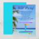 Invitation de fête SUP pour une adolescente pour un anniversaire ou une réunion estivale. Un fond d'arbre à pain et d'eau océanique avec du texte bleu foncé. Mon illustration représente une fille blonde debout sur une planche de paddle violet tenant une pagaie violette au-dessus de sa tête. Une tortue de mer nage à côté.