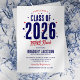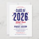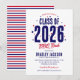 Invitez vos invités à une fête de fin d'études avec barbecue dans le jardin avec ces charmantes invitations. Avec un design d'étoile rouge et bleue patriotique, le titre "Promotion 2026" se démarque en gras, ce qui montre clairement que cette célébration est en l'honneur de la promotion diplômée. Et avec un modèle de texte personnalisable, vous pouvez facilement ajouter votre touche personnelle, rendant chaque invitation unique et spéciale.