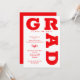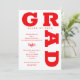 GRAD en lettres rouges grasses est inscrit autour des bords de ces invitations de fête de fin d'études blanches. VOIR TOUTE LA COLLECTION de combinaisons de couleurs prêtes à l'emploi, assiettes en papier, serviettes, boîtes de faveurs et invitations de fête de fin d'études dans notre magasin.