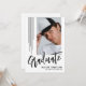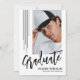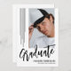 Invitations minimalistes de remise de diplômes avec un simple arrière - plan blanc qui peut être changé à n'importe quelle couleur, une photo de la grade, des lignes noires qui représentent les chaînes de goût d'une casquette de graduation, et un modèle de texte moderne qui est facile à personnaliser.