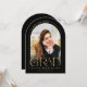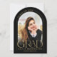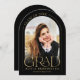Cette carte de graduation minimaliste en noir et or sert à la fois de faire-part de graduation et d'invitation à la grande fête, et comporte une photo, arche cadre et élégante typographie moderne.